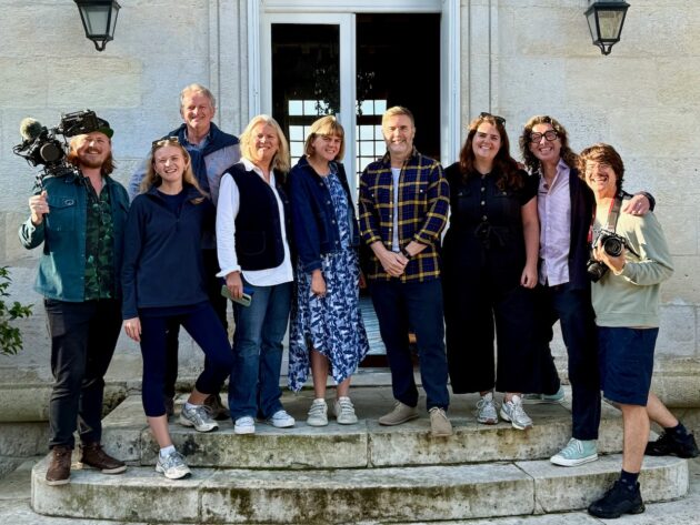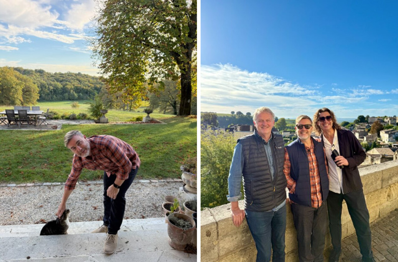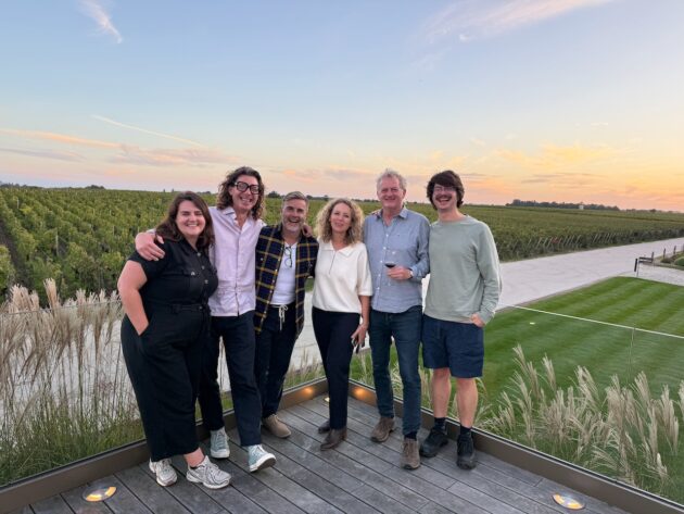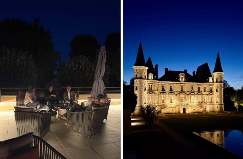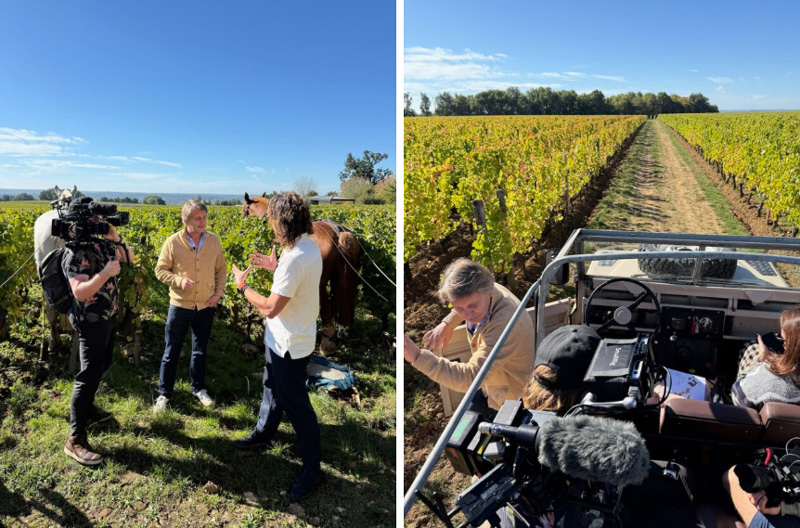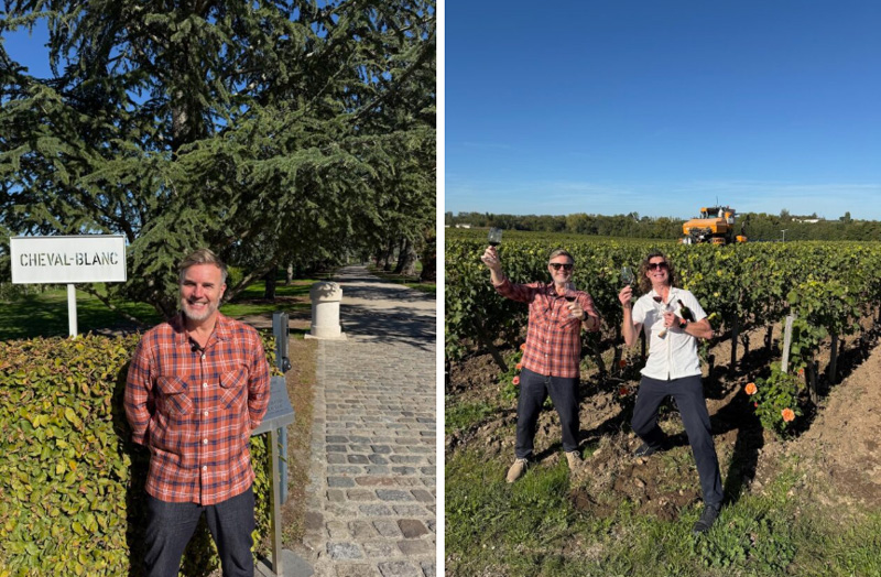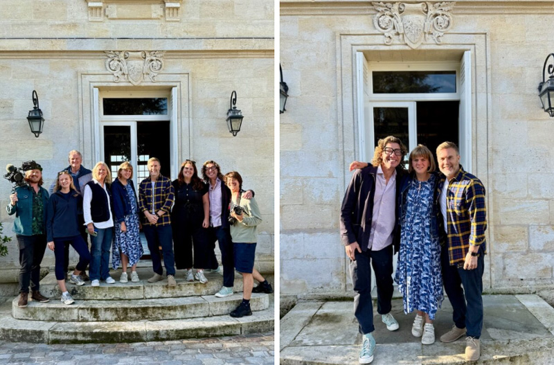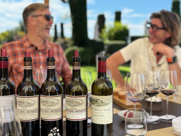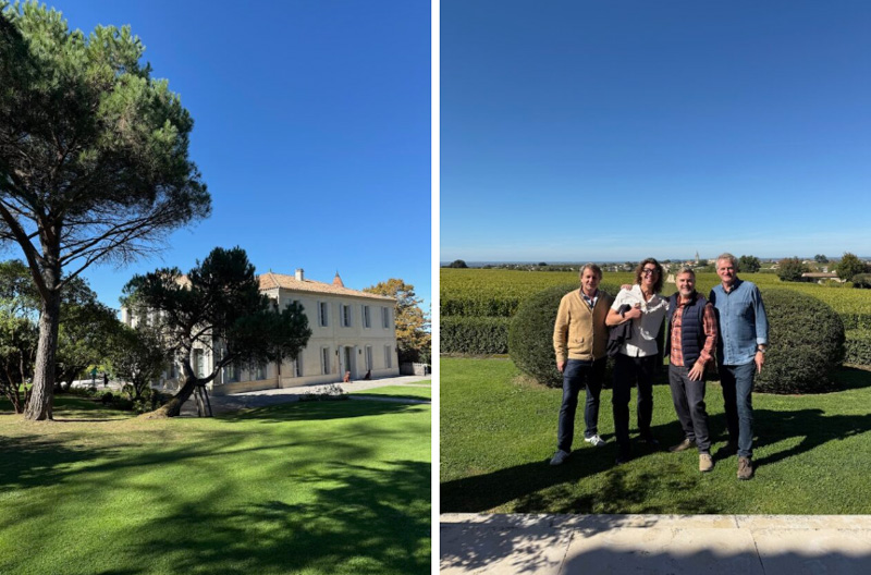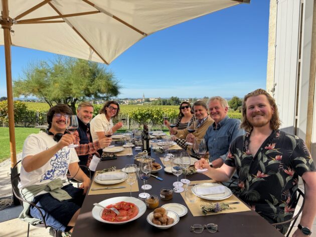 We lucked out with the weather and enjoyed a fine lunch on the adjacent terrace next to the château. There’s a Michelin starred restaurant behind the winery, by the way, with impressive views across the vineyards on the other side, called Les Belles Perdrix. On the left is Tom’s son and producer Fred, and on the right their videographer and cameraman Hayden, plus Gary’s assistant Emma.