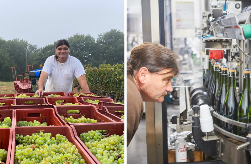 So too is this one of Daniel with the hand-picked grapes for the Crémant in 2021, left. That’s the vintage we’re currently selling at the château, direct in the UK and in Switzerland through Selection Schwander.