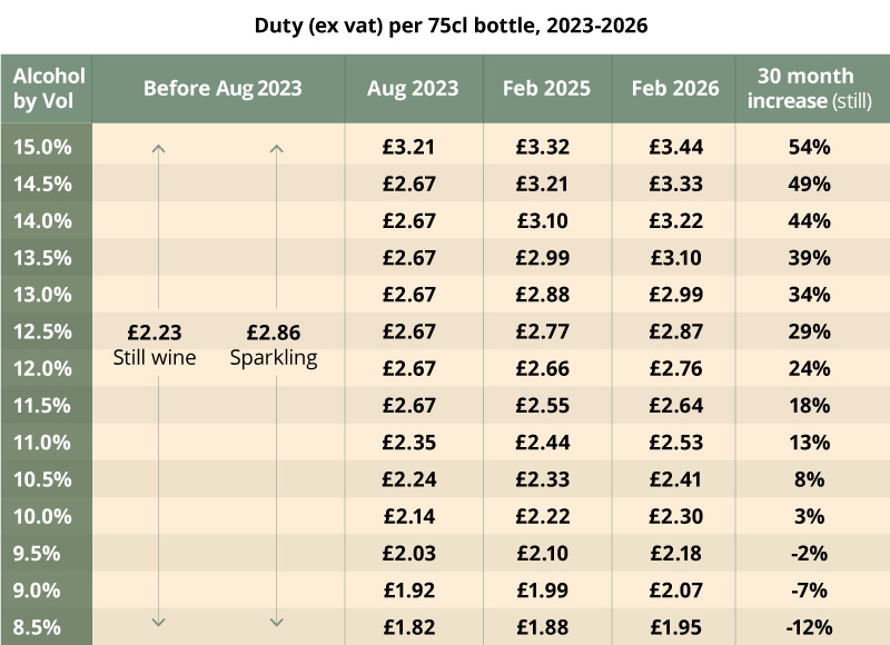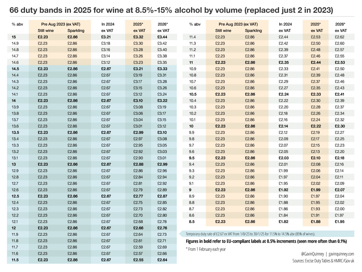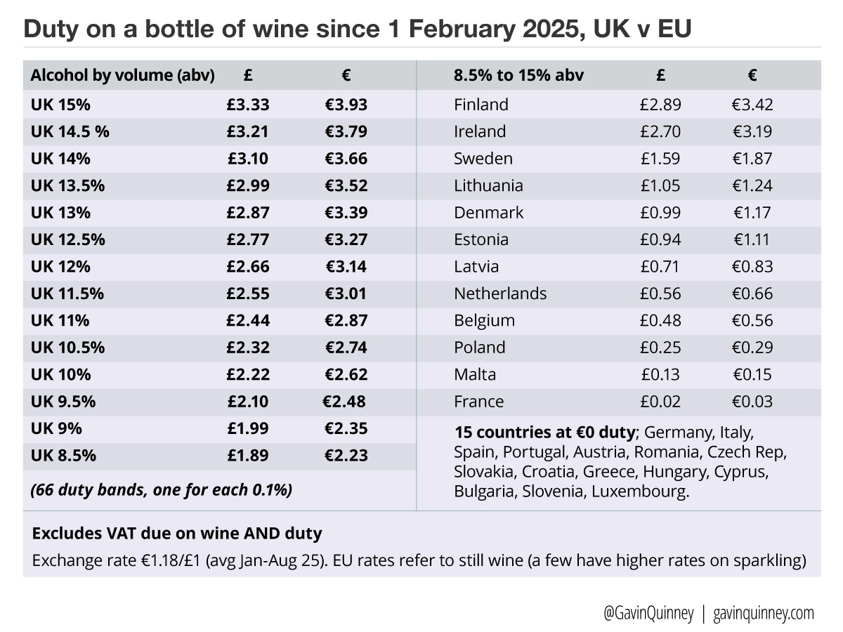 Here below are the numbers, using the current UK duty rate of £29.54 per litre of alcohol in any wine of 8.5%-15% abv, going up to £30.62 per litre from 1 February 2026.