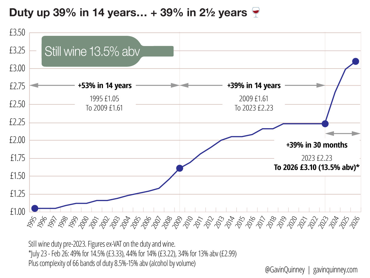 It’s hardly headline news – and barely gets a mention elsewhere – but UK duty on wine is set to rise again by the RPI of 3.66% on 1 February. Now that doesn’t sound a lot – about 9-12p plus VAT on a bottle of wine – but this should be seen in the context of the recent hikes and absurd levels of admin, courtesy of the Conservatives’ new wine duty system and not helped by a new Labour government which endorsed the policy and added further costs.