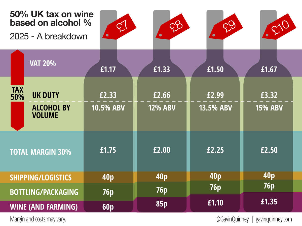 Here’s a fun graphic. These are the price points at which wines with different alcohol levels attract 50% UK tax – the duty and the VAT. This is before the increases in 2026. Margins and costs may vary, of course, but on the £3.50 to £5 that’s left respectively, there are plenty of factors to take into account.