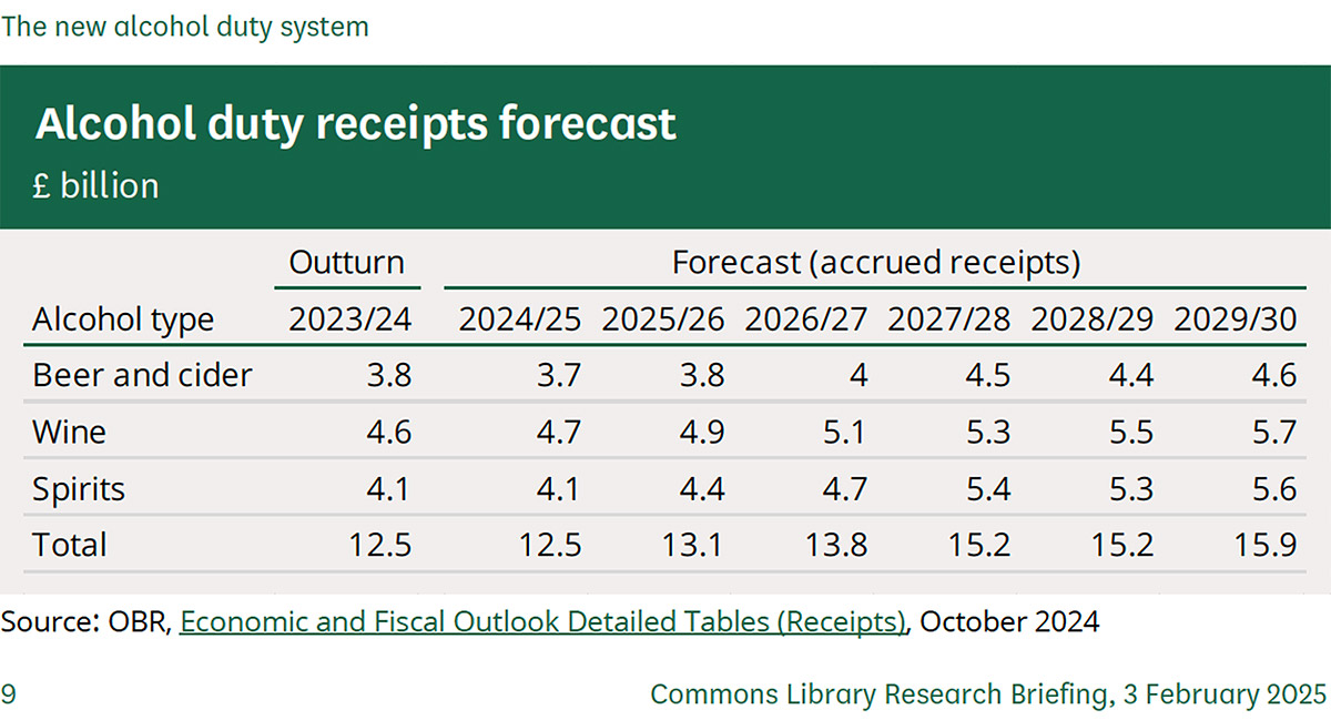 When the Government introduced the final change in the new duty system in February 2025, with scores of higher duty levels, the OBR’s forecast for total alcohol duty receipts was £13.1 billion, with wine accounting for £4.9 billion – the largest share. The screenshot above was taken from the new alcohol duty system on the House of Commons website.
