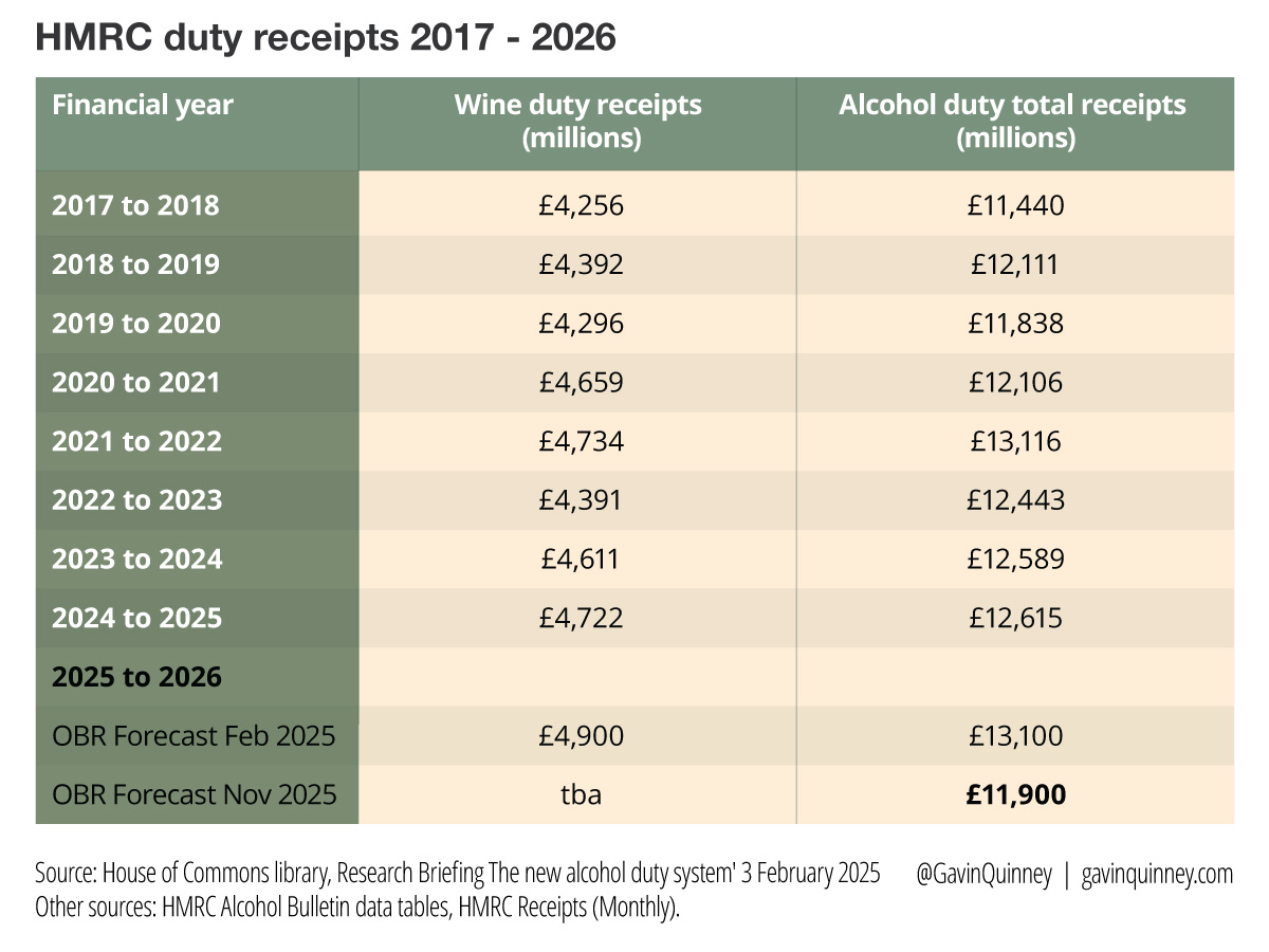 Wine tax receipts are down considerably this year – in the region of 6% – despite the substantial duty increases, and in this financial year to April 2026 we could see the lowest annual total for wine duty collected this decade – I’d predict around £4.4 billion. Oh, and the OBR have just downgraded their forecast of alcohol duty receipts from £13.1 billion to £11.9 billion. The increase come February won’t help.